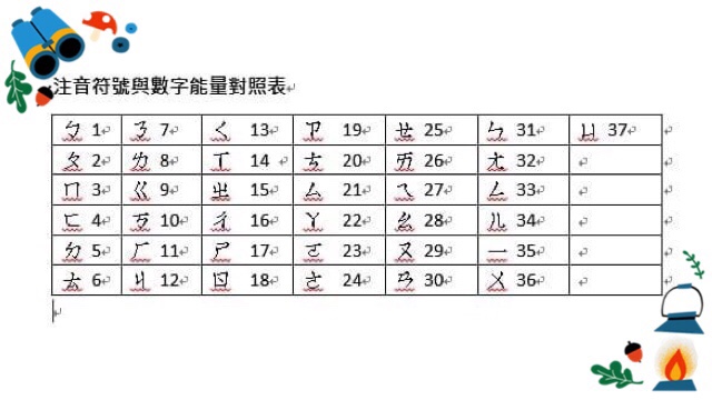 附圖是注音符號的編碼,(亦放上英文字母對應,方便習慣使用英文名字的人對照參考)分別計算姓名裡所對應的數字碼,個別加總至個位數,但如果特別出現大師數字,也可以參考大師數字能量。