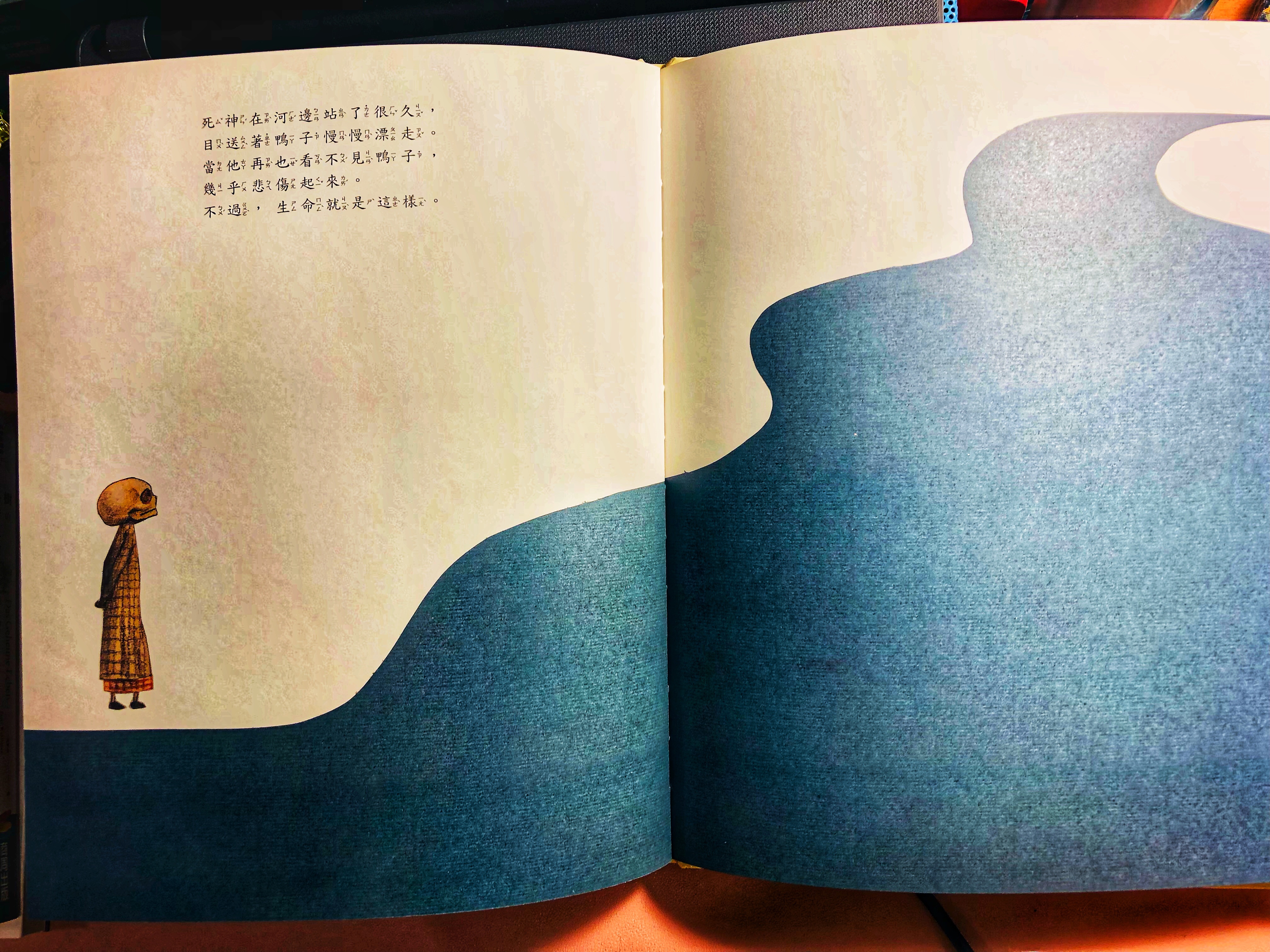 打開書的第一秒開始,就會被文字與圖畫的清淨給吸引,溫馨的色調讓我們揮別對死亡的既定印象—冰冷。雖然作者讓死神的造型依然帶點骷顱頭的形象,但隨著鴨子與死神的對談,漸漸地,好像能理解無論生與死,都是生命河流的一部分。