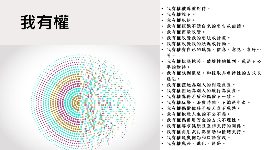 - 我有權有自己的感覺、信念、意見、喜好……等。