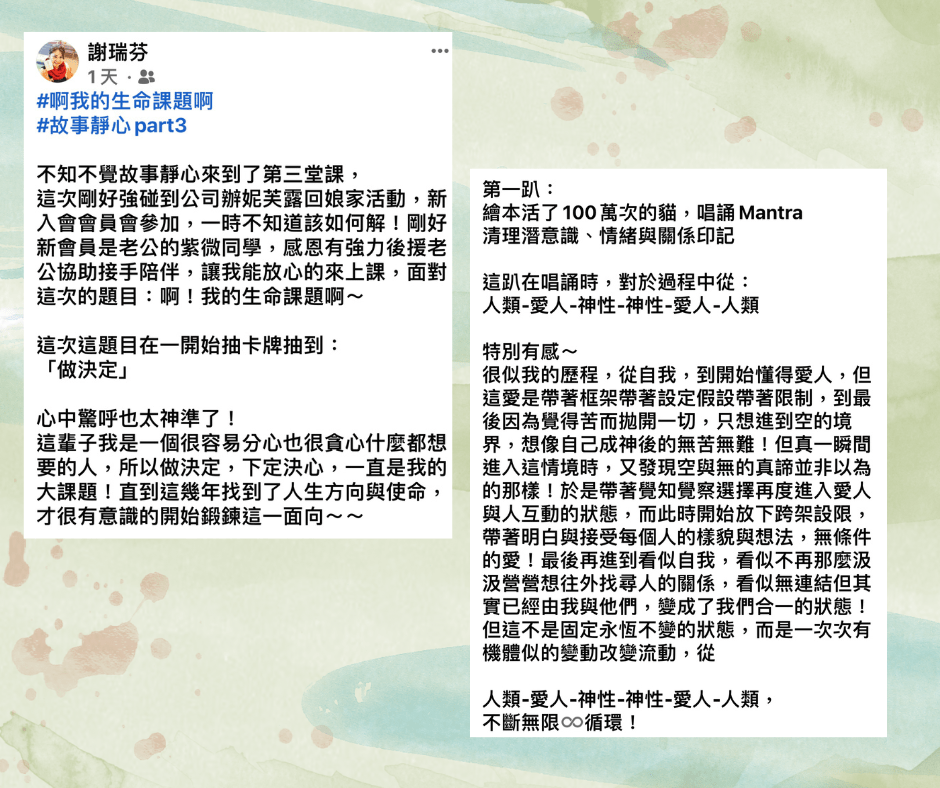 附圖裡摘錄參與者(可愛的瑞芬)寫下的課後筆記,深刻體會每一場靜心中與內在對話的領悟,文字寫來真實動人。