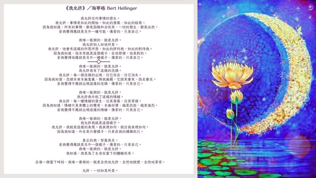 「今天的議題很有趣,先是有海寧格的《我允許》,然後允許自己一切的發生;去尋找自己的平靜;找受傷的自己;還有心中有洞怎麼去修復;但我自己可能在設定人際界線還是挺有實行的困難。目前,我可能也還沒辦法跟受傷或困惑的自己獨處,因為還不知道出口在哪裡,所以總是先睡一覺等氣消了再說。但是,或許,今天的課,就是埋下一顆種子,慢慢的,我會找到光,找到生命的出口。」