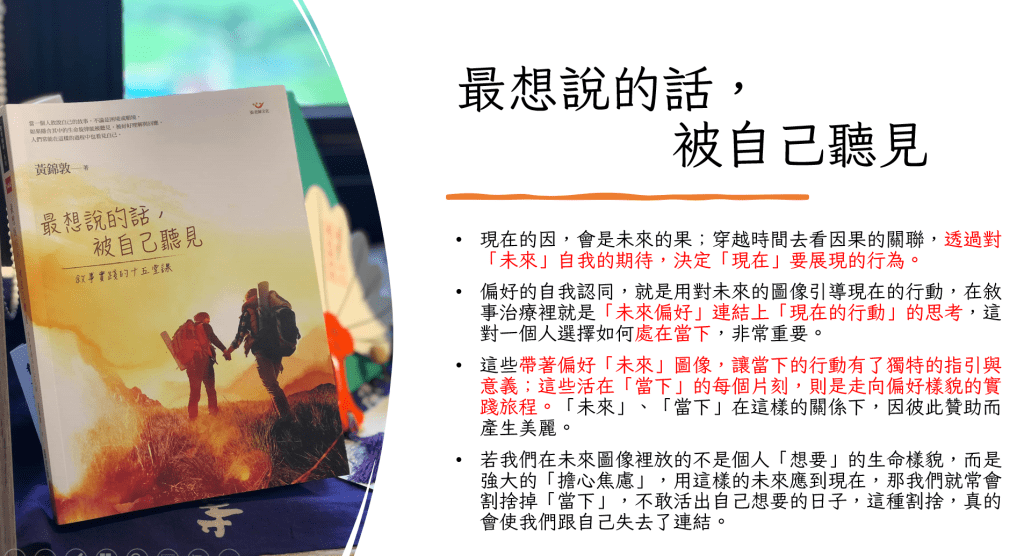 •偏好的自我認同,就是用對未來的圖像引導現在的行動,在敘事治療裡就是「未來偏好」連結上「現在的行動」的思考,這對一個人選擇如何處在當下,非常重要。
