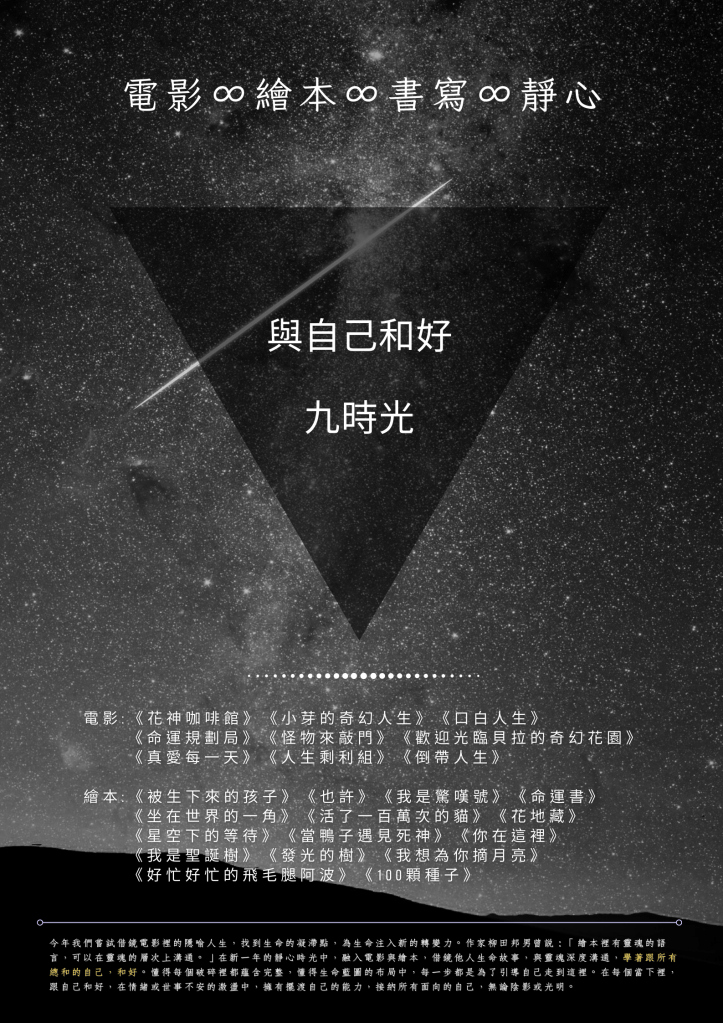 與高雄接納自閉症學會合作一個月一次的心靈修復靜心課,今年嘗試借鏡電影裡的隱喻人生,找到生命的凝滯點,為生命注入新的轉變力。作家柳田邦男曾說:「繪本裡有靈魂的語言,可以在靈魂的層次上溝通。」在新一年的靜心時光中,融入電影與繪本,借鏡他人生命故事,與靈魂深度溝通,學著跟所有總和的自己,和好。懂得每個破碎裡都蘊含完整,懂得生命藍圖的布局中,每一步都是為了引導自己走到這裡。在每個當下裡,跟自己和好,在情緒或世事不安的激盪中,擁有擺渡自己的能力,接納所有面向的自己,無論陰影或光明。