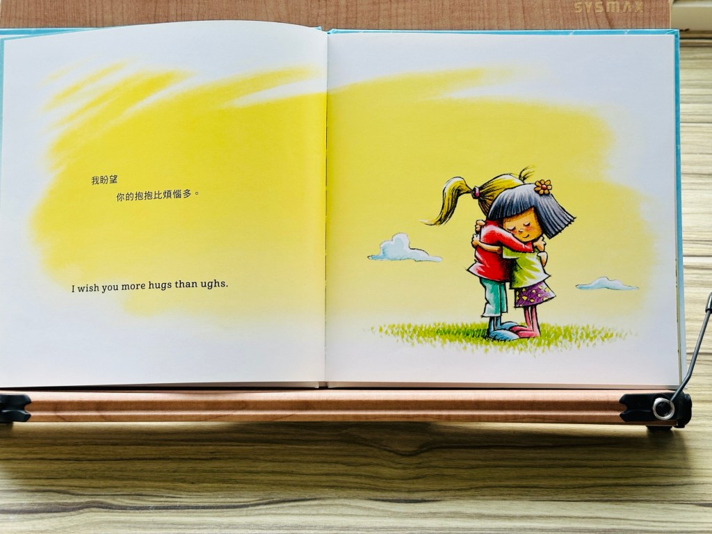 「I wish you more hugs than ughs. 我盼望,你的抱抱比煩惱多。」
