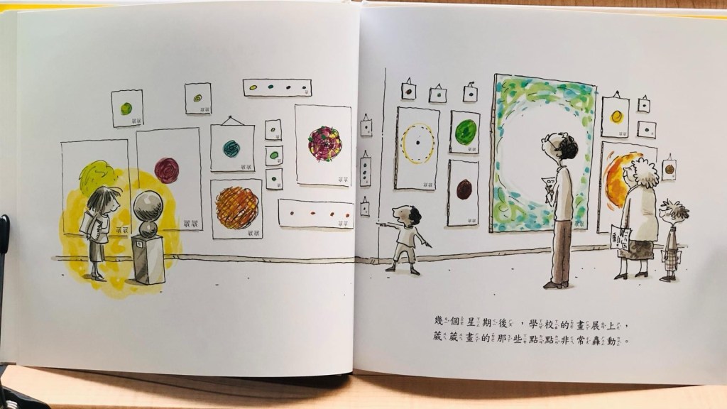 繪本裡的老師,第一件事,讓葳葳署名,而這是葳葳會做的事,她也開開心心地寫下自己的名字。幾天後,當葳葳又走進美術教室時,意外發現老師座位背後有一幅被裱框的畫作,正是自己上次大筆一揮的點作。通常會那樣裱框與掛置在顯眼位置的畫作,一定是被老師珍惜與賞識的。美術老師等於給予葳葳一次無聲的讚揚,此舉,大大鼓舞了葳葳。她心想,如果那樣不起眼的點都被老師讚賞了,她能做的可比那個多了,於是開始願意嘗試從顏色、大小、甚至延伸了點的各式各樣想像。之後學校舉辦了一場美術作品展,葳葳所畫的各式各樣的點,獲得全校師生的注目。甚至,鼓舞了一位也宣稱自己連直線都畫不直的小男孩,勇敢踏出被世俗框架限制與止步的「畫畫」。
