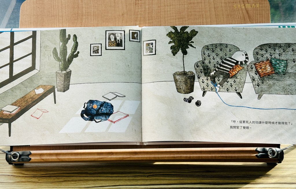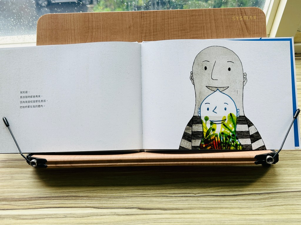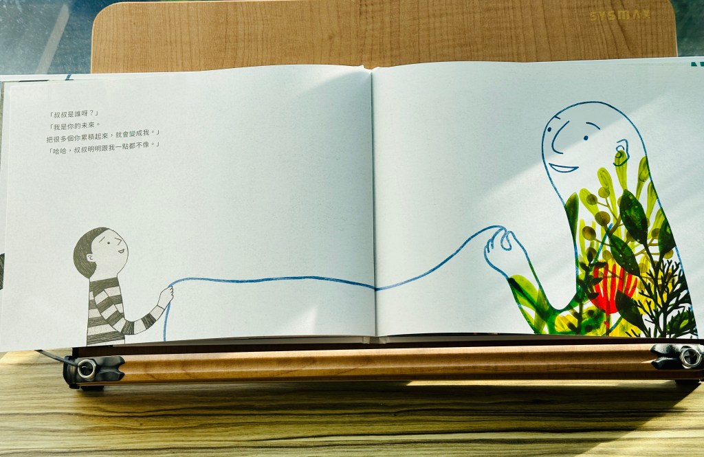 《我》這部繪本少見的套書,封面各有一條線牽引著一個成人與一個小孩,倒不是標註適合成人或小孩閱讀,而是具有深意的在之中穿針引線,讓時光不再只是標示著過去、現在與未來的時間軸,而是當你願意向內在走,它會牽引你遇見不同時空的自己,成為自我救贖的時空超人。