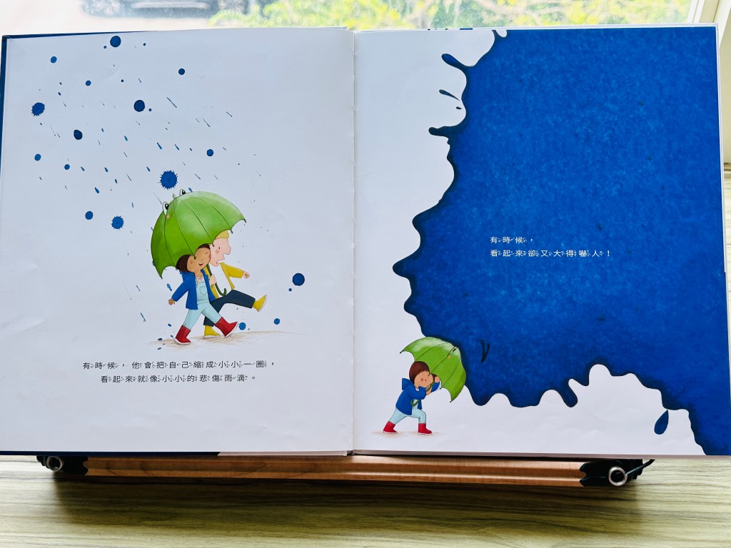 直到有一天,當我們深深看入悲傷精靈的眼裡,決定讓他留在身邊,願意哄他、與他對話、書寫心情,去到哪裡都帶著他,讓自己進入悲傷裡以淚水宣洩,漸漸地,在這樣的陪伴過程,能感覺悲傷變輕。但也是在這過程裡,作者特別繪作悲傷歷程中,可能內在會升起愧疚感,不容許自己快樂,悲傷似乎害怕我們變得快樂,或者害怕我們再度受傷,因此防備著。但儘管如此,因為我們走在與悲傷同在的自我修復之旅,當我們決定將愛也分享給悲傷時,似乎意味著我們的內在有更寬廣的空間,容納各種情緒的起降,曾經的情緒巨人,在我們內在變得寬廣時,像是縮成小小的身量隱在眼淚背後。