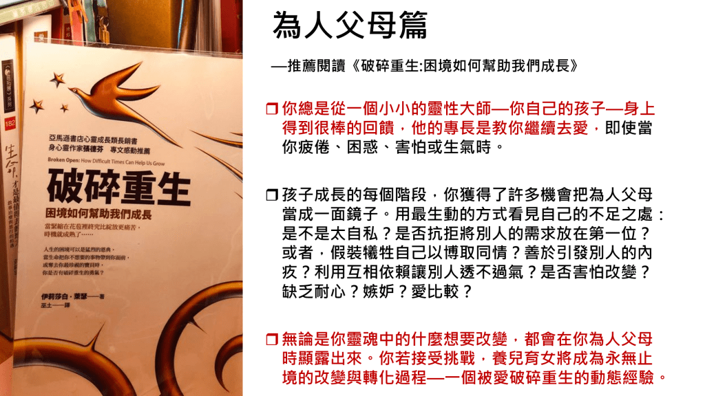 第二堂的與自己和好靜心課程中,推薦了一本延伸閱讀書籍——《破碎重生–困境如何幫助我們成長》。這是一本在其他作者敘事書寫時提及的一本書,於是找來看,其中提及為人父母的篇章——是的,為人父母經常是每個人獲得靈性修練的最佳機會——十分動容,因此摘錄出來跟夥伴分享。