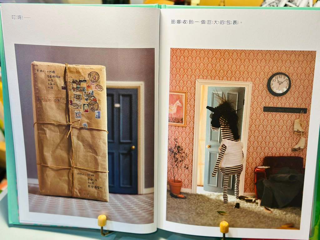 白希那會中答問時,提及了繪本裡有個很重要的隱喻,在斑娜低潮時,她總是戴著眼罩,那原是取材自為了讓賽馬專注眼前跑道而戴上的工具,在斑娜逐漸走出陰霾時,她再也不需要遮罩生活裡的美好一切,她的生活不再只限縮在眼前單一的通道。當她的生日終於到來那天,她滿懷喜悅打開魔法衣櫥裡卻發現只有一頂生日帽,之前總是一整套完美配搭消失無蹤,大失所望的她取消了原定的盛大派對,又窩回了床上哭著睡著。當她醒來時,卻發現鏡中的自己已化身為美麗的獨角獸,擁有飛天的翅膀。但隨著飛翔的美夢,魔法衣櫥最大的禁忌是衣物不能碰水,一場大雨的到來,徹底將斑娜打回原形。