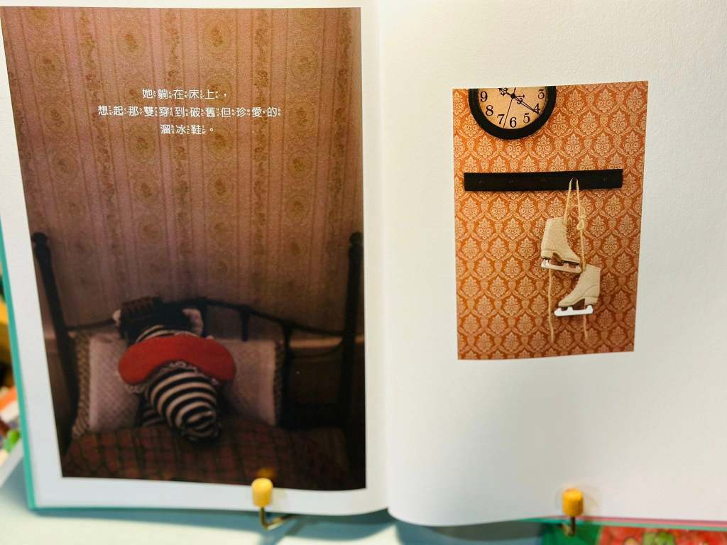 讀著繪本的我們,一定也會跟著彷若掉入深淵。但是,如果細讀繪本,會發現,繪本故事裡曾兩次提及吊掛在牆上的冰刀鞋,我猜想,斑娜之前應該是專注在溜冰場上的選手,當她穿上冰刀,她就是世上獨一無二可以在空中飛旋的獨角獸。那麼,生命裡一定出現了什麼挫折,讓她將冰刀鞋束之高閣,也讓她陷入低谷。這是作者白希那沒有清楚寫出的故事線,但她的作品裡都有人生的百滋百味值得細品。